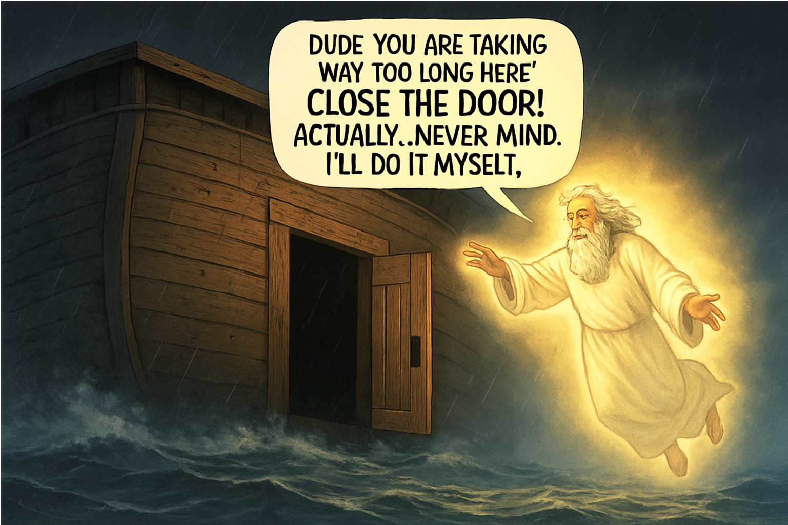 To be fair, the Biblical language is actually vague here. It doesn’t specify that they needed God to close the door. Below is all the Bible has to say on the matter.